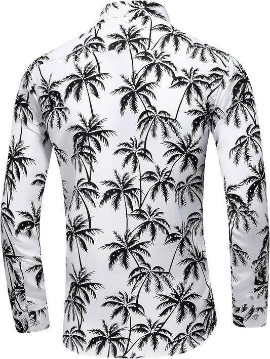 Men'S Printed Beach Hawaiian Button-Down Slim Fit Long Sleeve Dress Shirt (7015 White, Large)